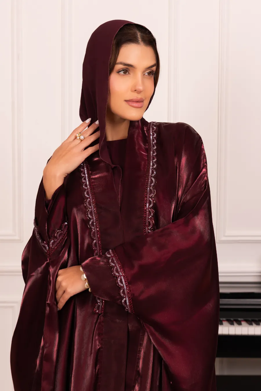 Crafted from lustrous fabric that catches the light with every movement, this piece embodies timeless elegance.